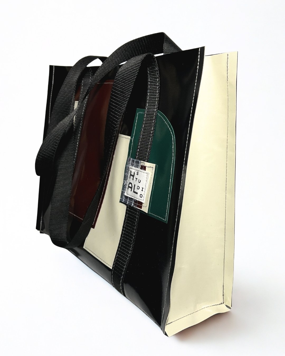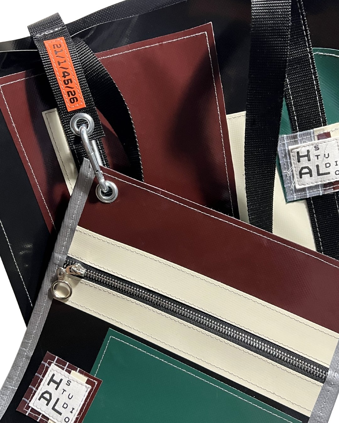 Çanta etiketi, yine atık kumaşlar üzerine serigraf baskı yöntemiyle üretilir ve Hal Studio’nun üretim sürecinde ortaya çıkan branda artıkları üzerine dikilerek tamamlanır.