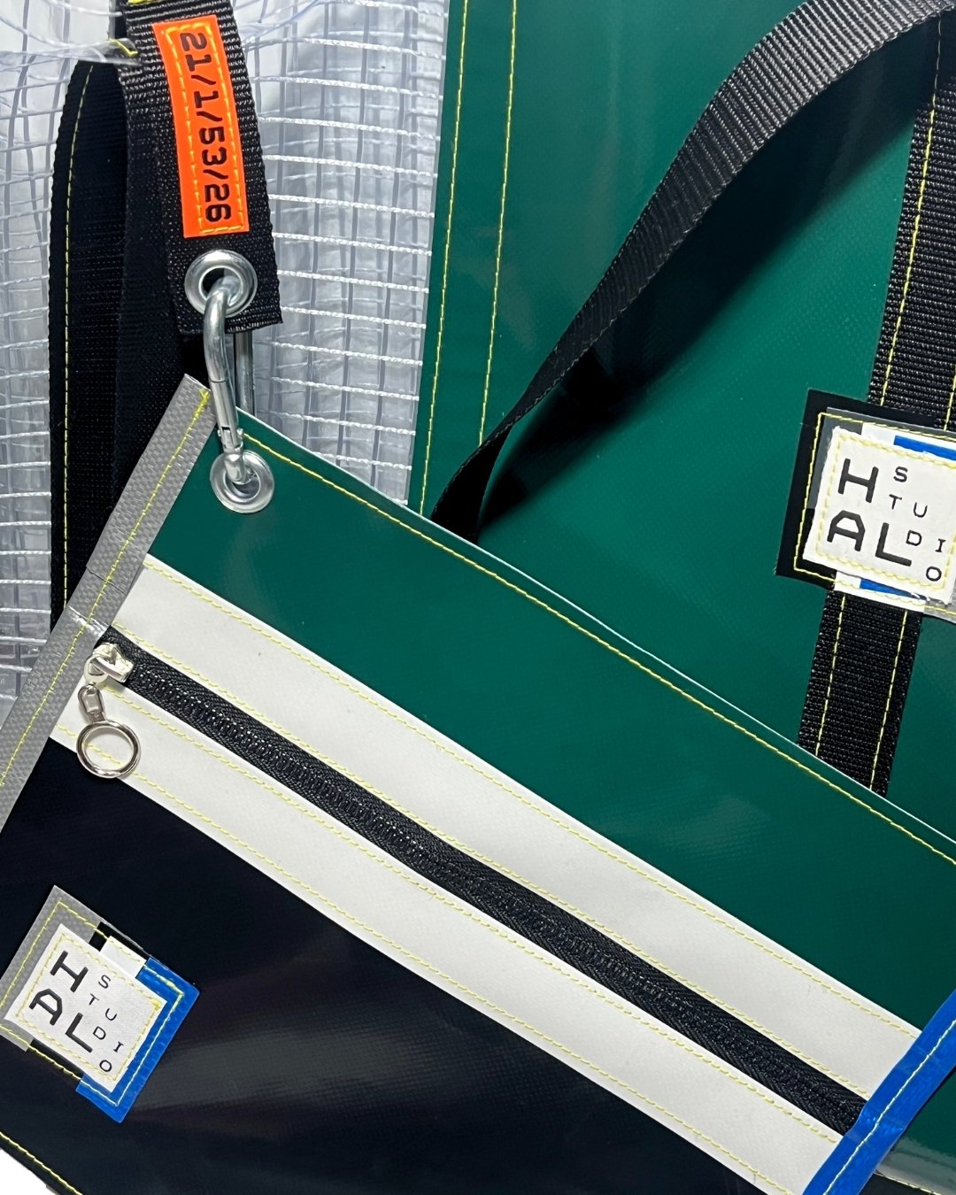 Çanta etiketi, yine atık kumaşlar üzerine serigraf baskı yöntemiyle üretilir ve Hal Studio’nun üretim sürecinde ortaya çıkan branda artıkları üzerine dikilerek tamamlanır.
