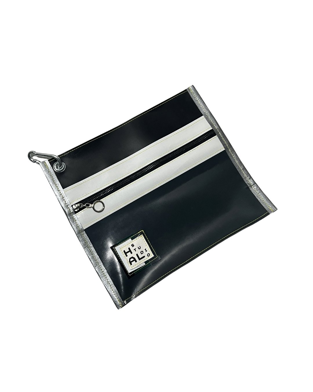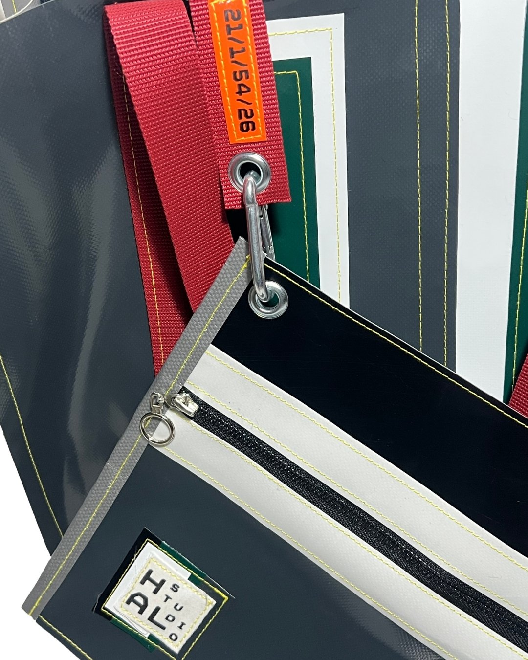 Çanta etiketi, yine atık kumaşlar üzerine serigraf baskı yöntemiyle üretilir ve Hal Studio’nun üretim sürecinde ortaya çıkan branda artıkları üzerine dikilerek tamamlanır.