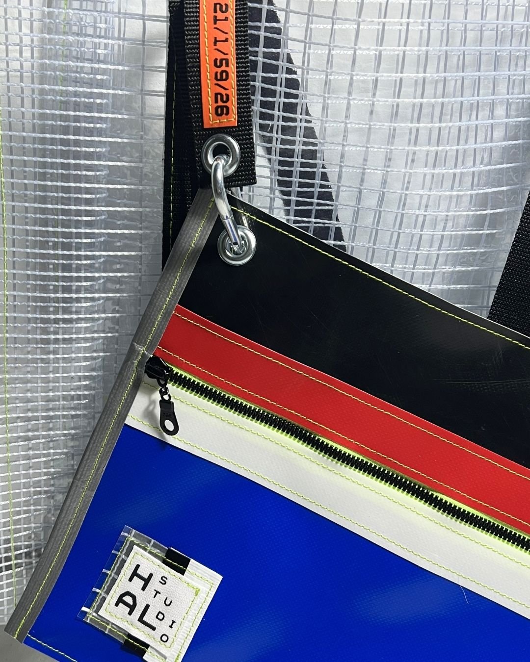 Çanta etiketi, yine atık kumaşlar üzerine serigraf baskı yöntemiyle üretilir ve Hal Studio’nun üretim sürecinde ortaya çıkan branda artıkları üzerine dikilerek tamamlanır.