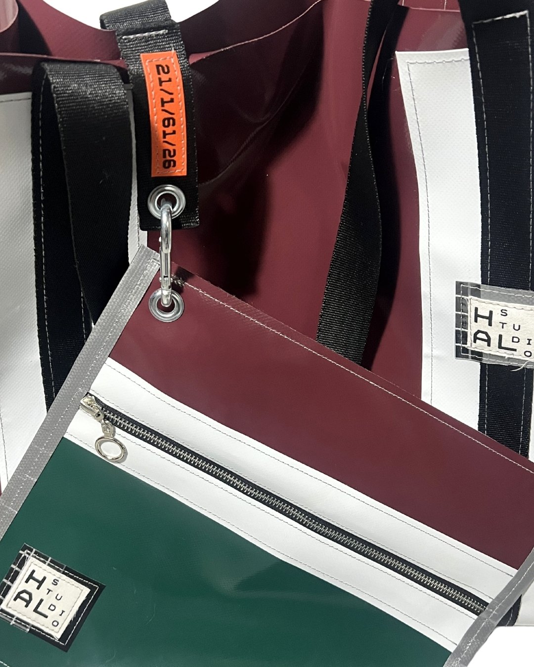 Çanta etiketi, yine atık kumaşlar üzerine serigraf baskı yöntemiyle üretilir ve Hal Studio’nun üretim sürecinde ortaya çıkan branda artıkları üzerine dikilerek tamamlanır.