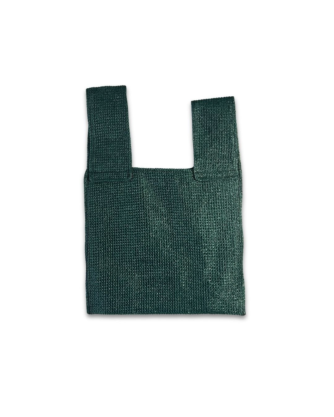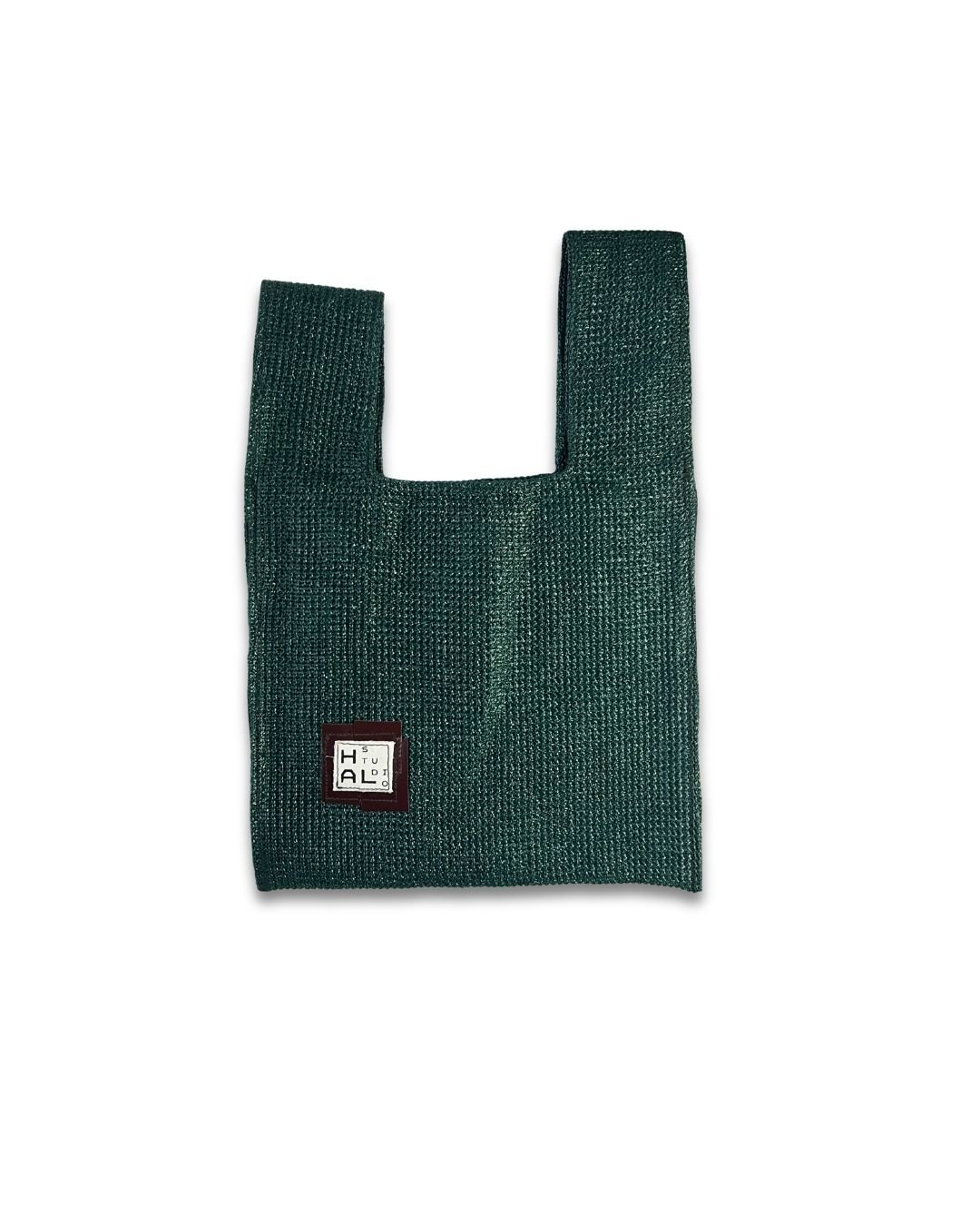 Atık gölgelik fileden ileri dönüşüm yöntemiyle üretilmiş, tek ve tekrar edilemez el çantası.