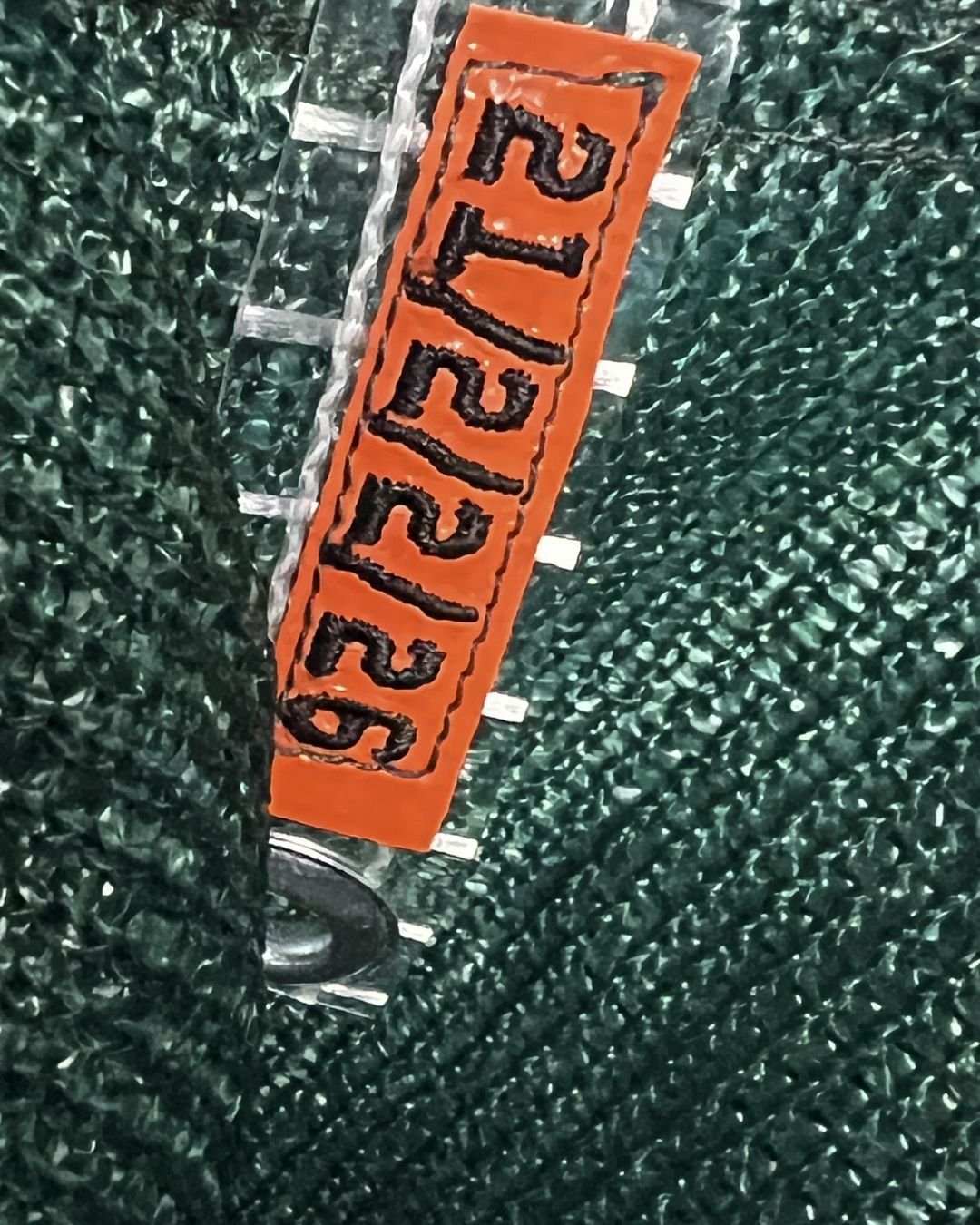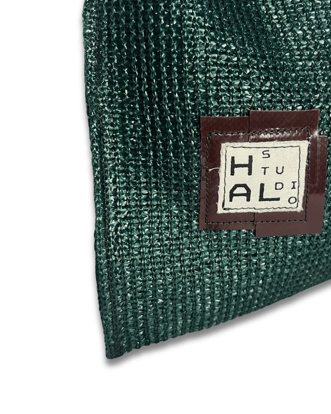 Çanta etiketi, yine atık kumaşlar üzerine serigraf baskı yöntemiyle üretilir ve Hal Studio’nun üretim sürecinde ortaya çıkan branda artıkları üzerine dikilerek tamamlanır.