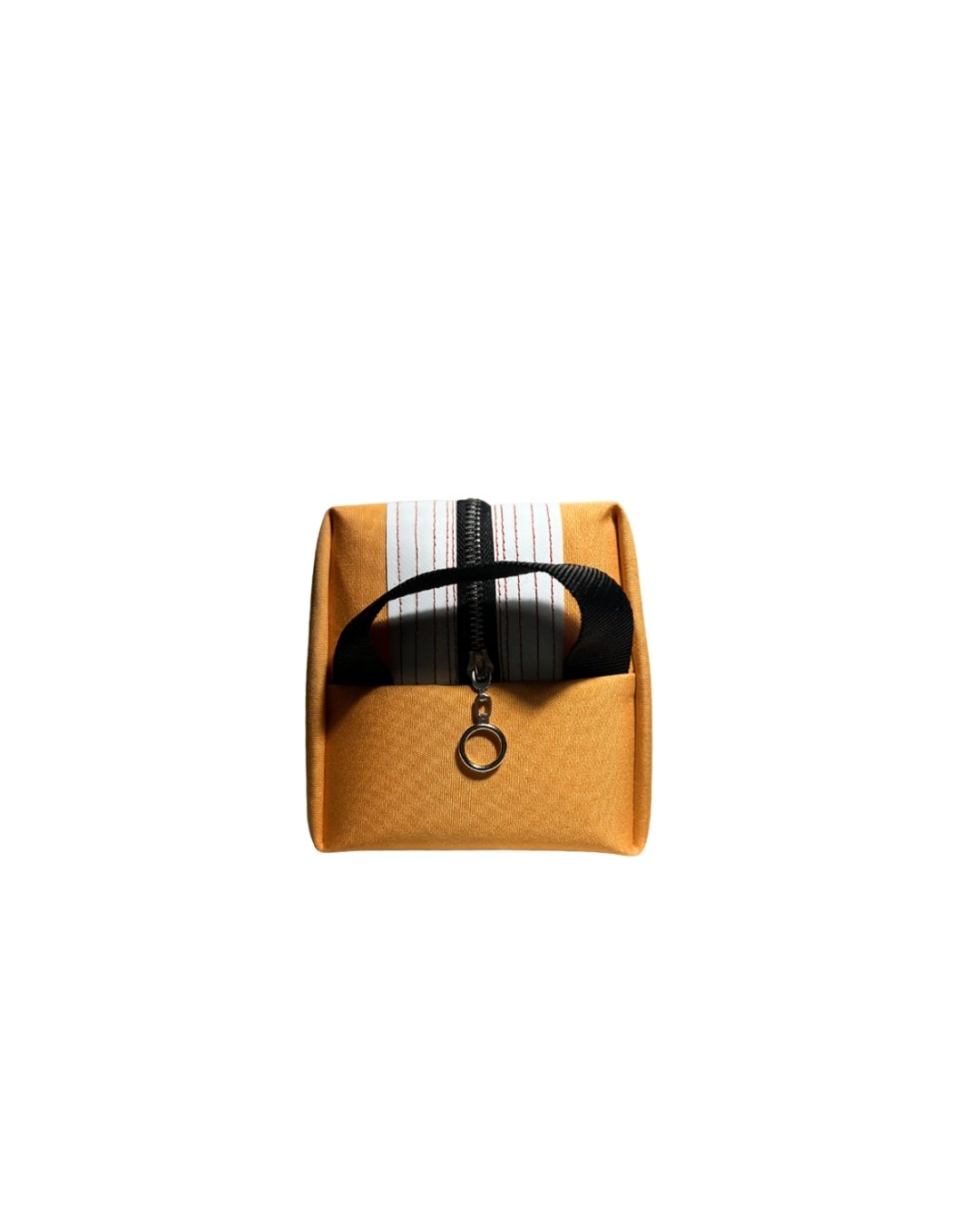 Makyaj çantası Kartal Branda’nın üretimlerinden arta kalan ve atık haline gelmiş branda parçalarının yeniden değerlendirilmesiyle üretilmiştir. Her parça elde kesilir, temizlenir ve yeniden kurgulanır. Bu nedenle hiçbir ürün birebir aynı değildir.