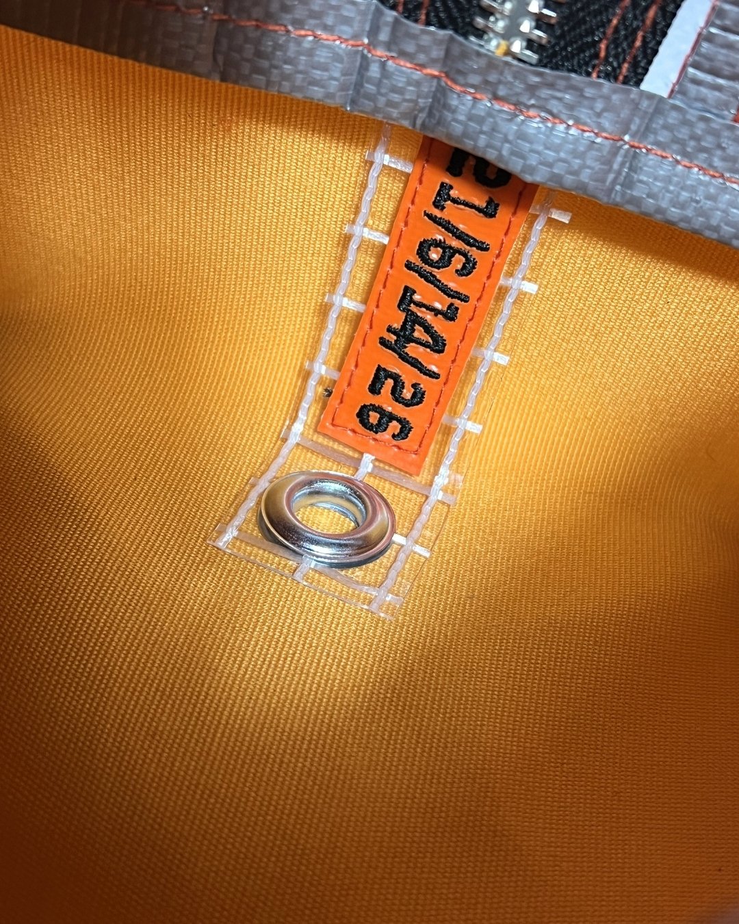 Çanta etiketi, yine atık kumaşlar üzerine serigraf baskı yöntemiyle üretilir ve Hal Studio’nun üretim sürecinde ortaya çıkan branda artıkları üzerine dikilerek tamamlanır.