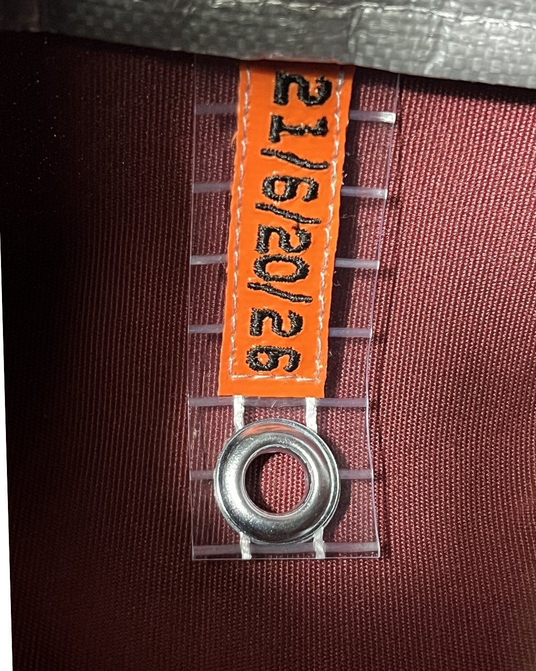 Çanta etiketi, yine atık kumaşlar üzerine serigraf baskı yöntemiyle üretilir ve Hal Studio’nun üretim sürecinde ortaya çıkan branda artıkları üzerine dikilerek tamamlanır.
