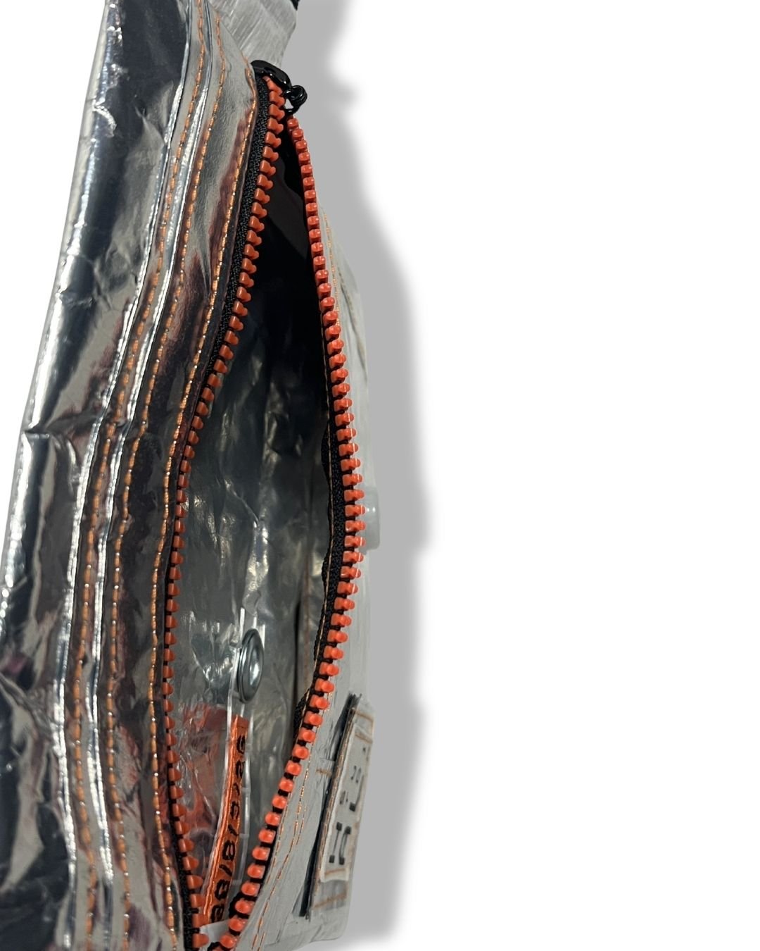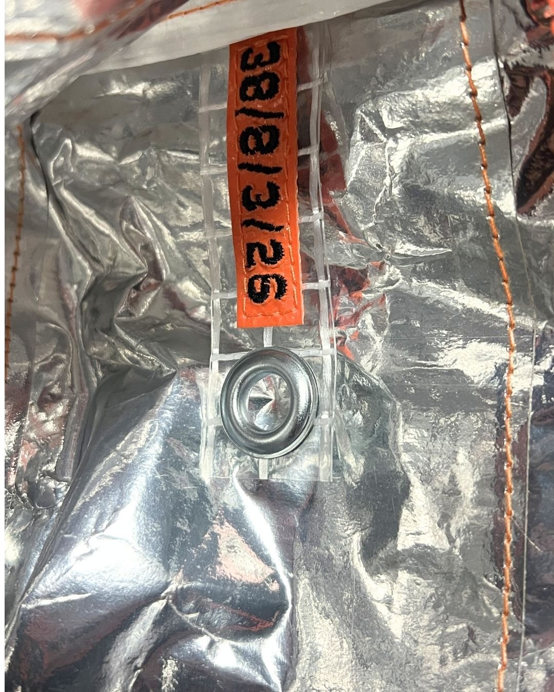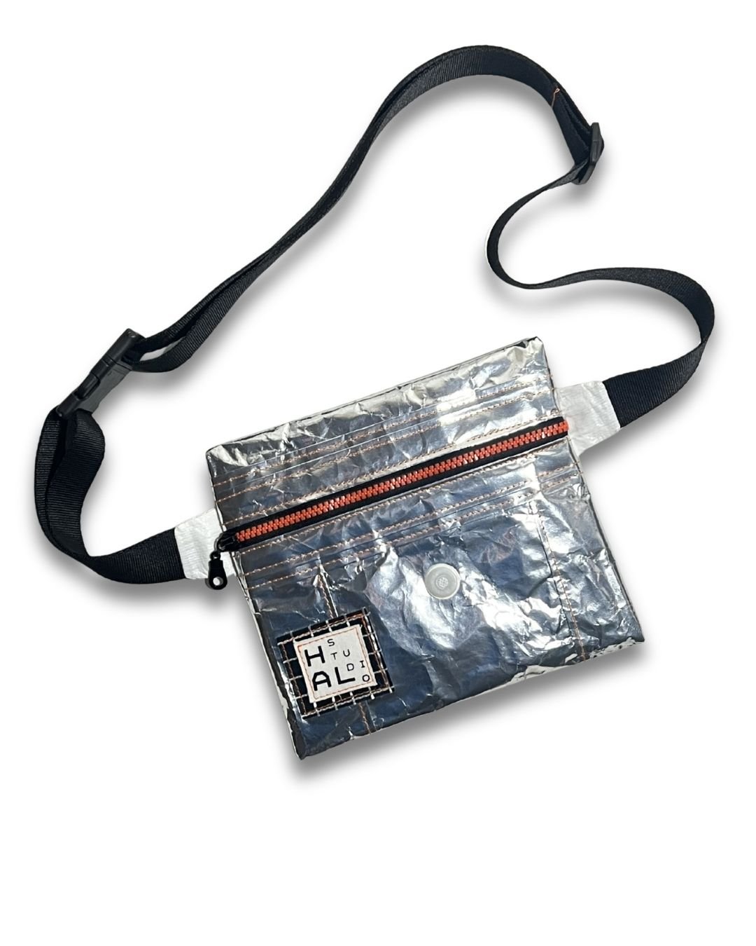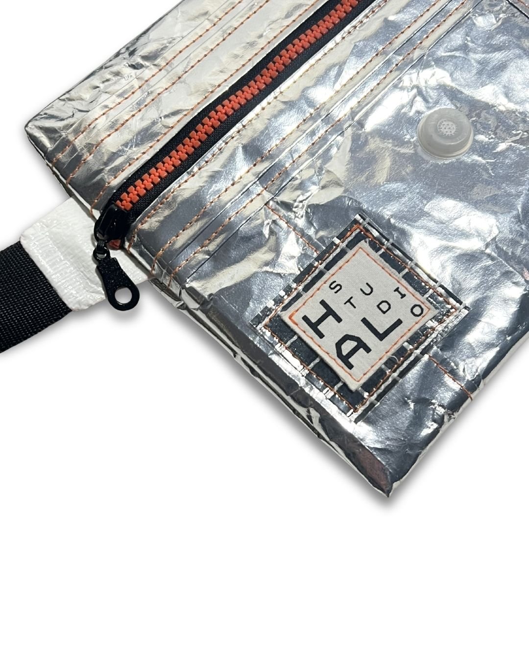 Çanta etiketi, yine atık kumaşlar üzerine serigraf baskı yöntemiyle üretilir ve Hal Studio’nun üretim sürecinde ortaya çıkan branda artıkları üzerine dikilerek tamamlanır.