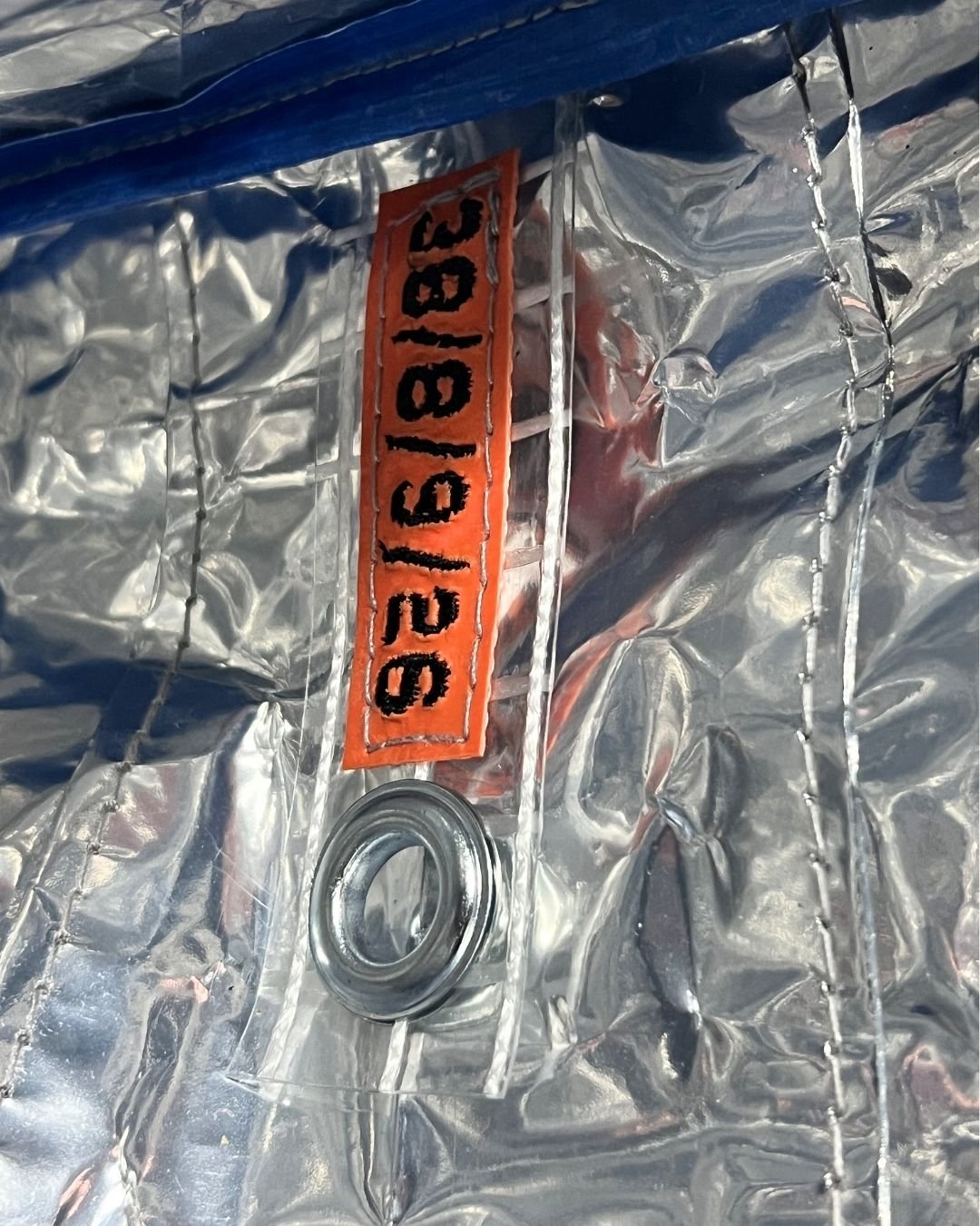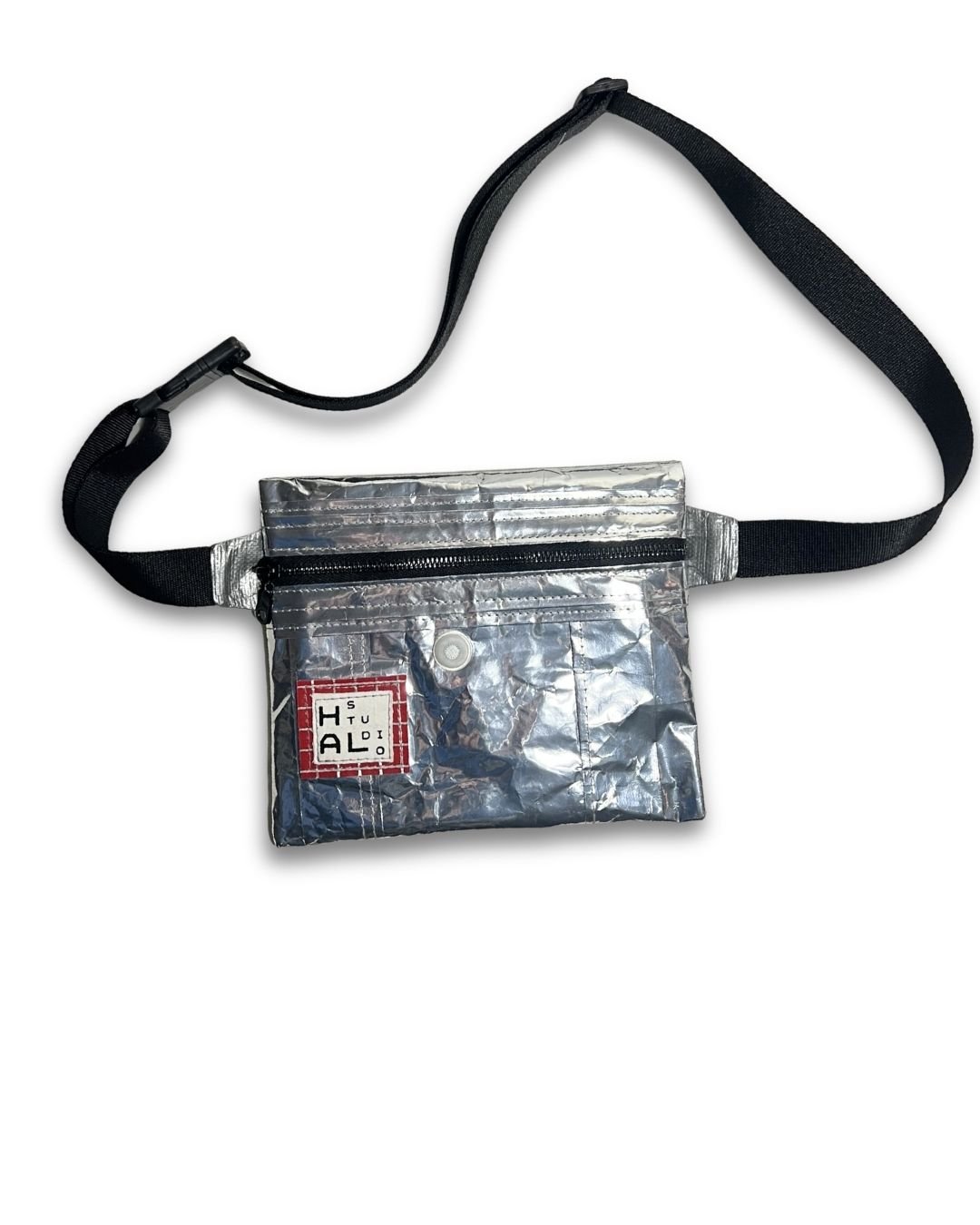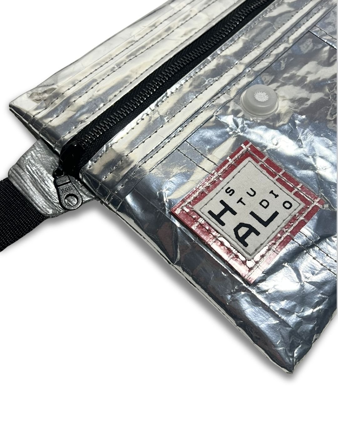 Çanta etiketi, yine atık kumaşlar üzerine serigraf baskı yöntemiyle üretilir ve Hal Studio’nun üretim sürecinde ortaya çıkan branda artıkları üzerine dikilerek tamamlanır.